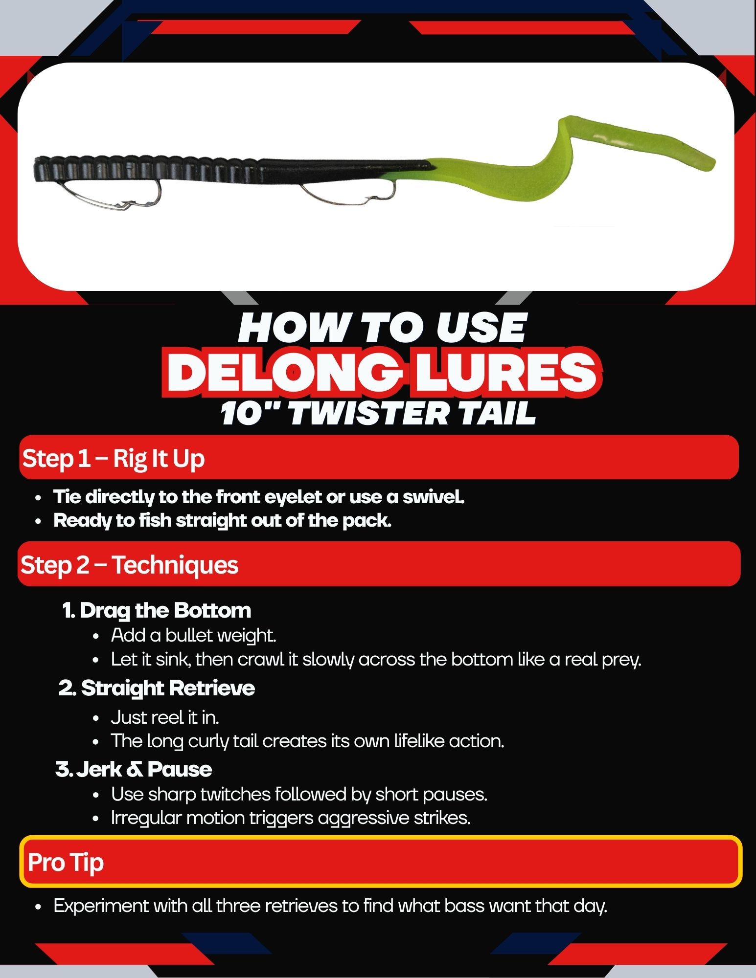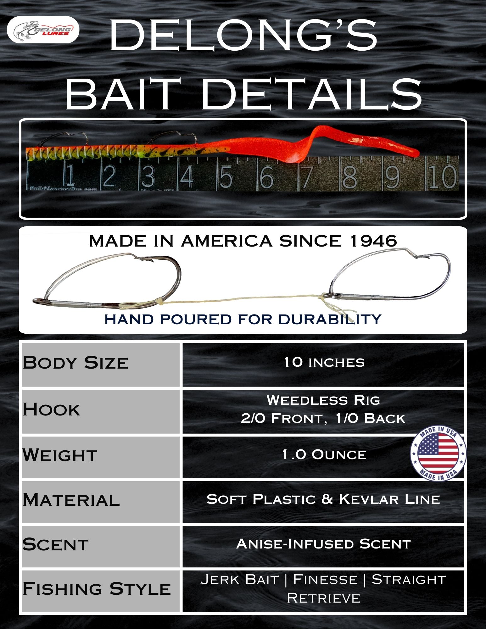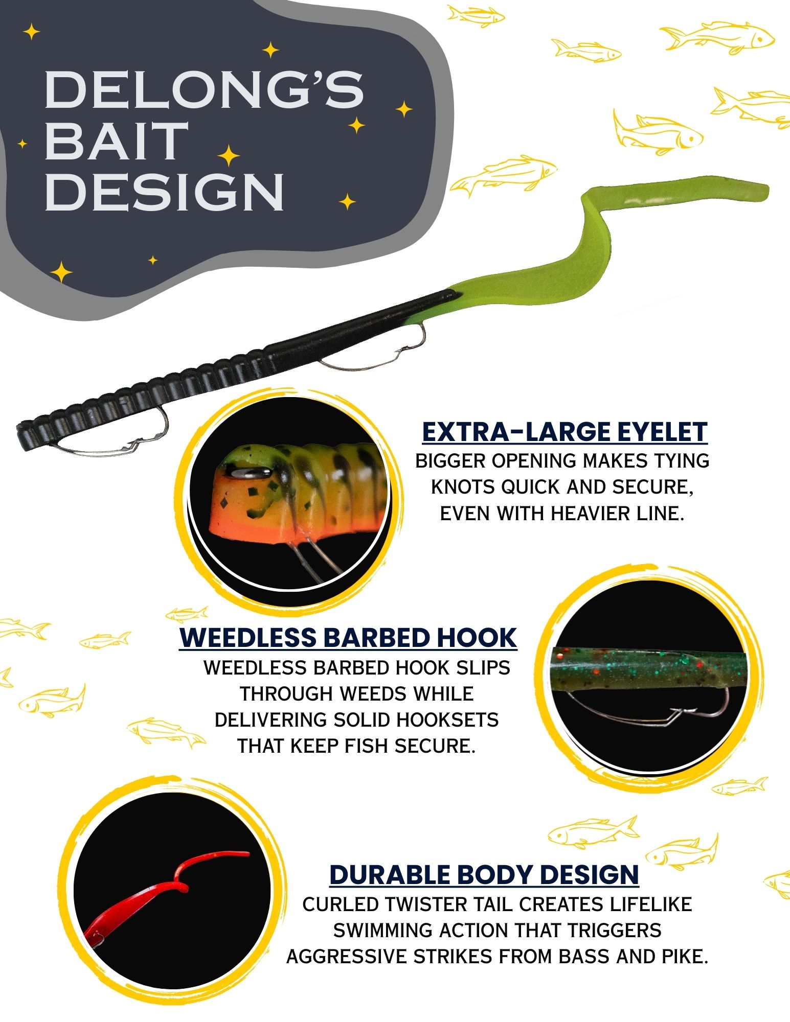 The 10″ Weedless Twister Tail worm is great for largemouth bass, smallmouth bass, pike and many other species of fish! DeLong Lures are always hand poured, hand tied Kevlar rigs, made in America, with anise scent mixed directly into the plastic. We go above and beyond in every step of the lure making process to help you get more for your money, catch more fish, and earn life long customers! try our hand poured made in America fishing lures for bass today and you wont be disappointed!