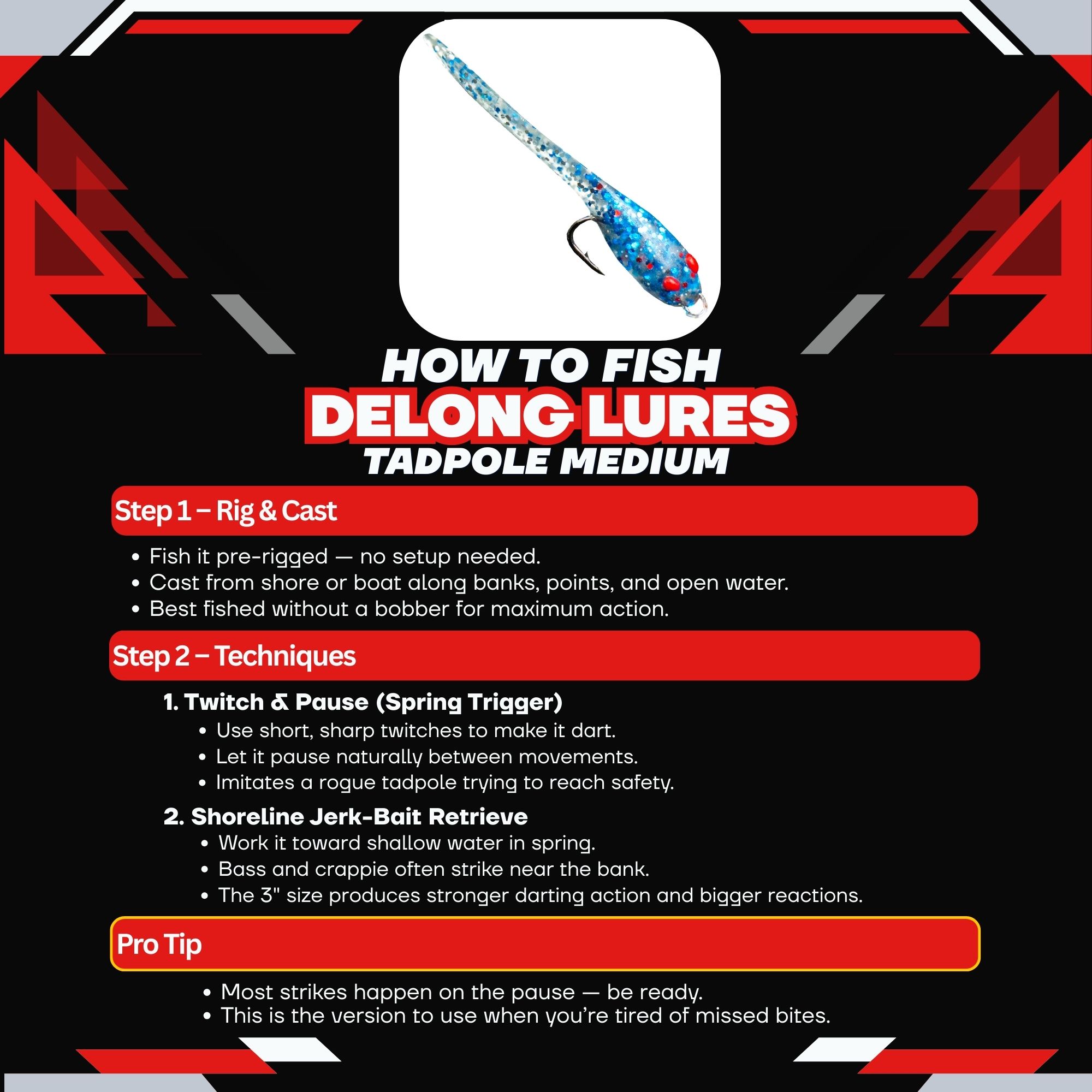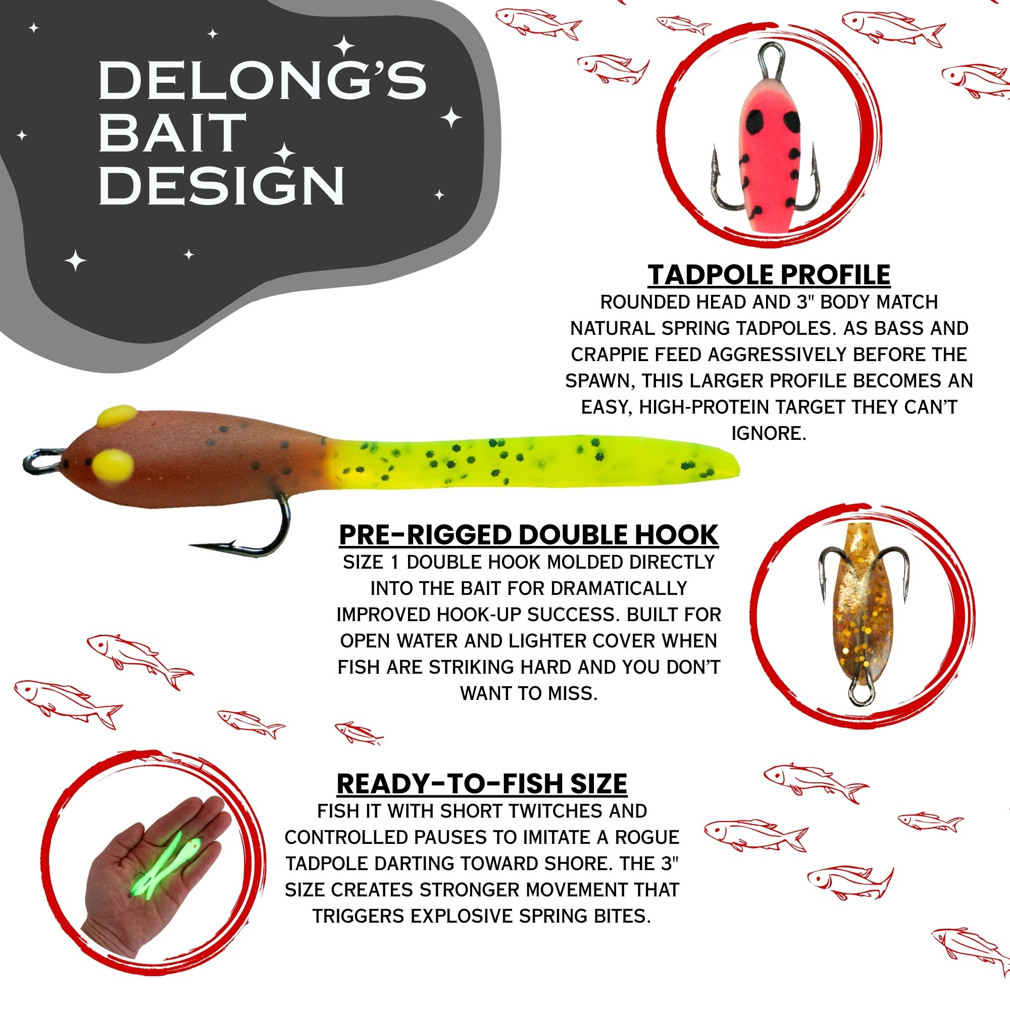 When frogs appear, tadpoles are everywhere, and fish are actively feeding on them. The DeLong 3″ Rigged Tadpole was designed to mimic this exact food source during the most productive time of year—spring.