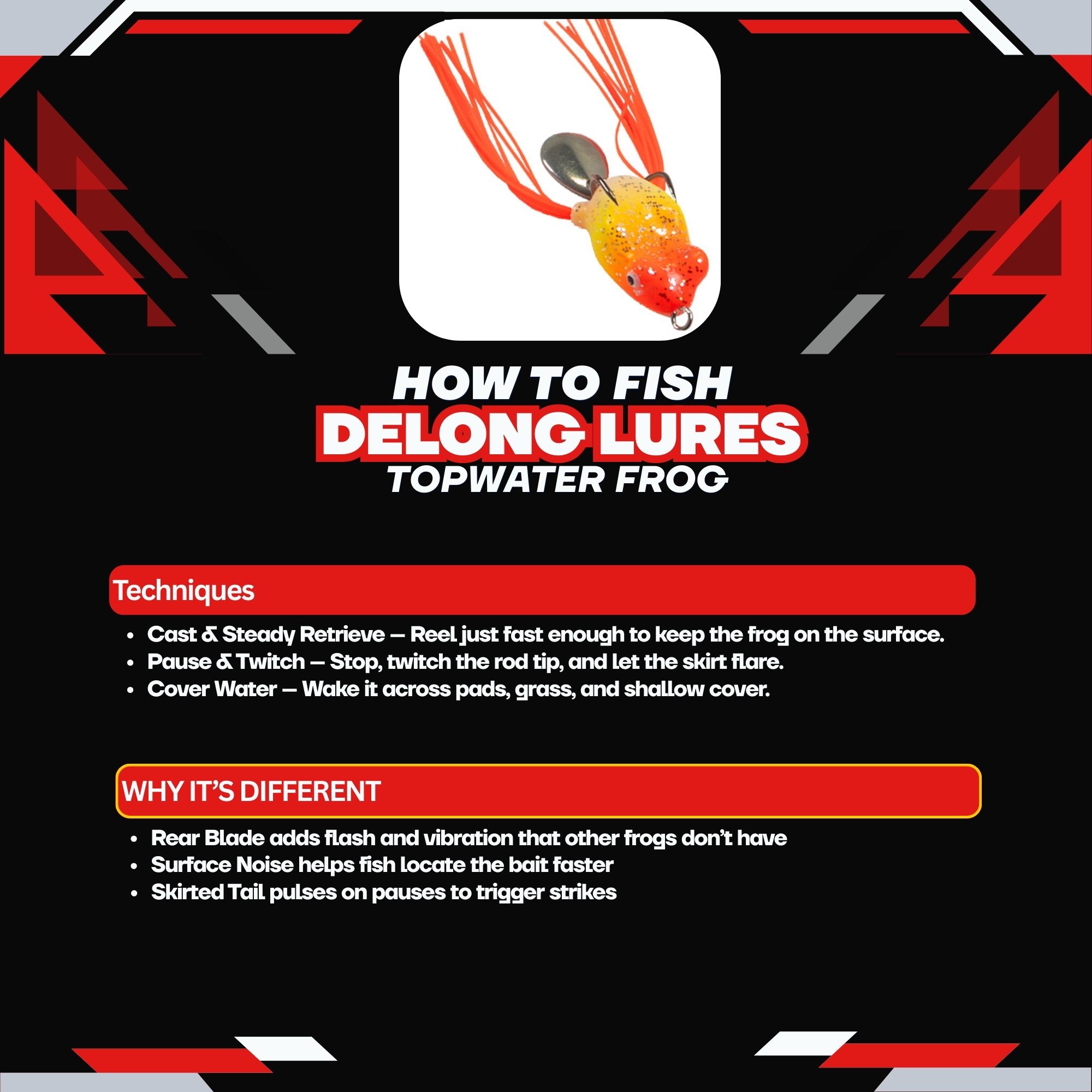 • Combines the attraction of a buzz-style frog with the realism of a traditional skirted frog