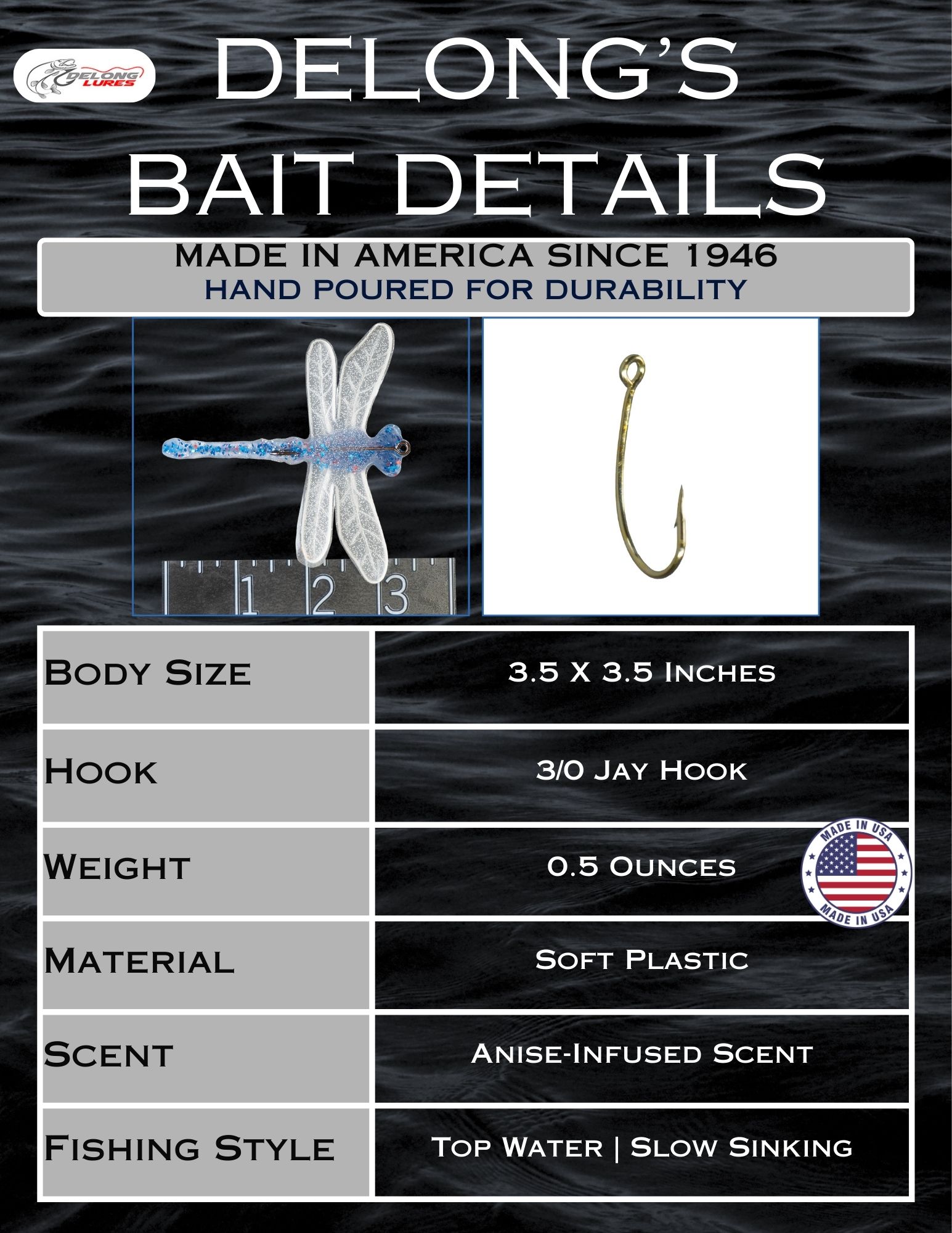 A: Every Large Dragonfly is handcrafted in Ohio, USA, using DeLong’s signature soft plastic and anise scent formula.