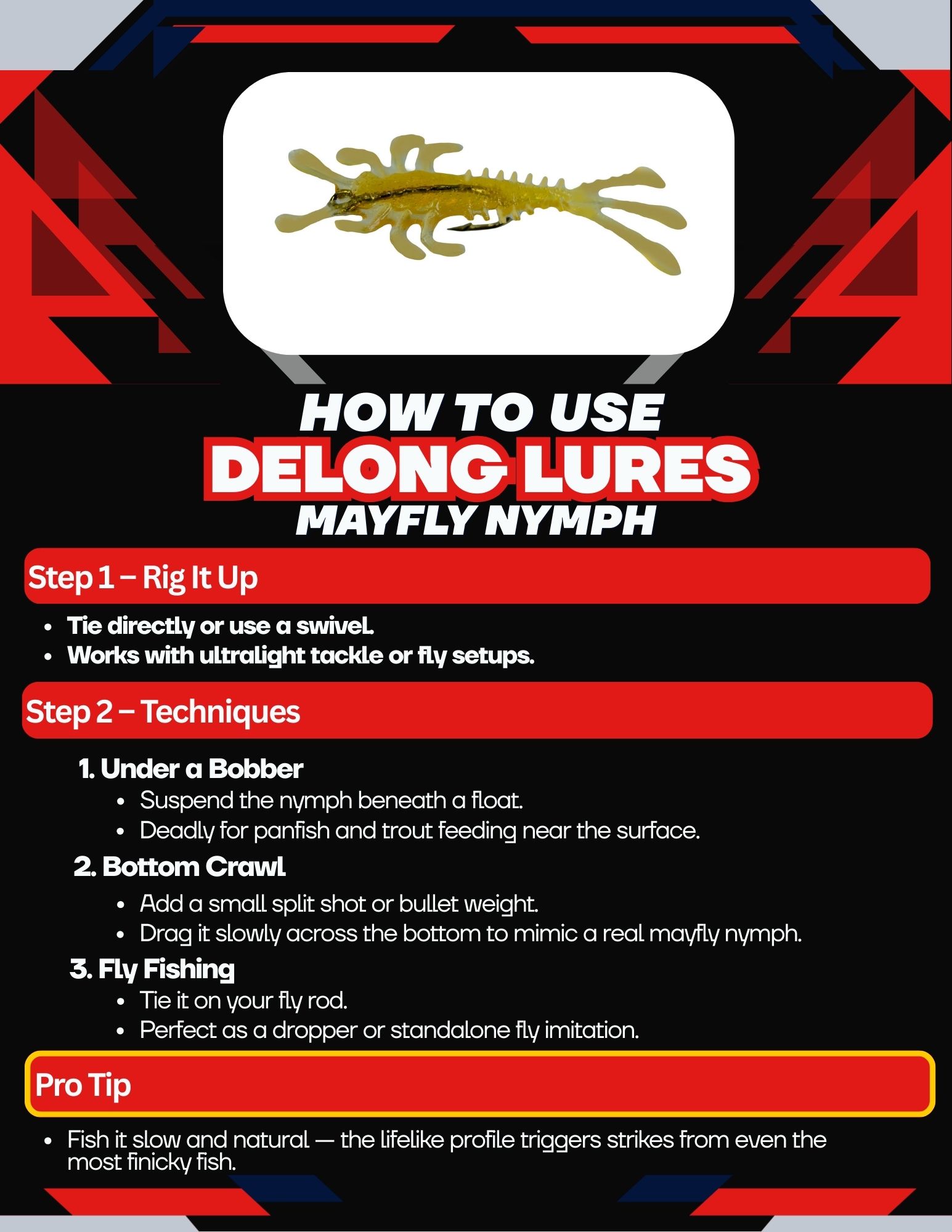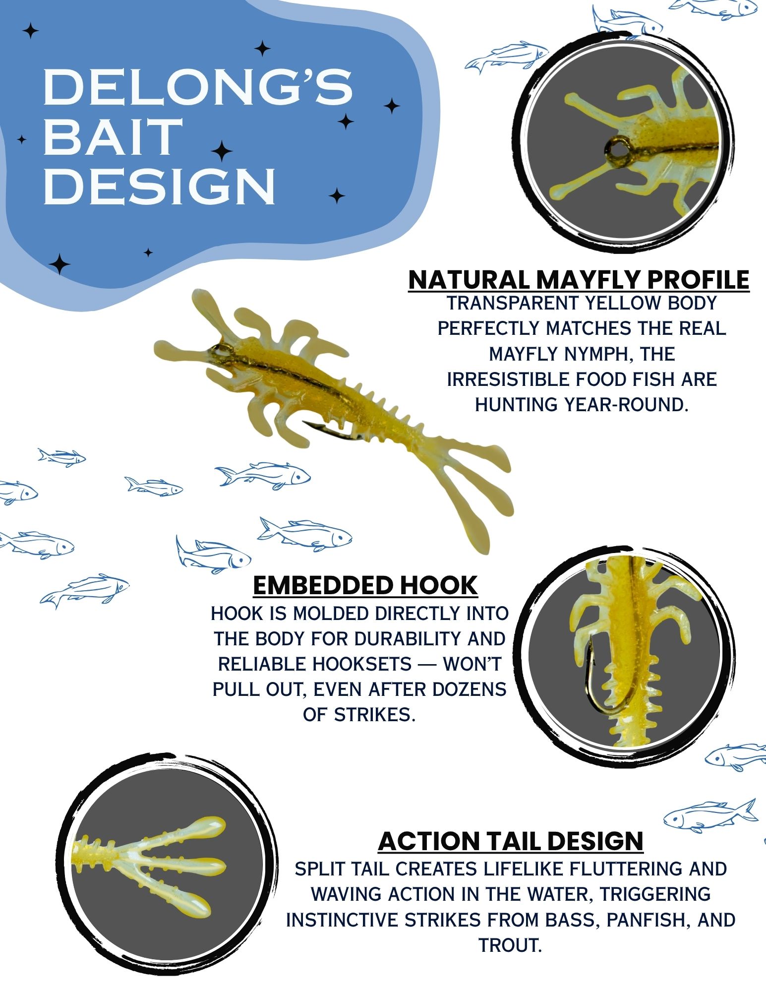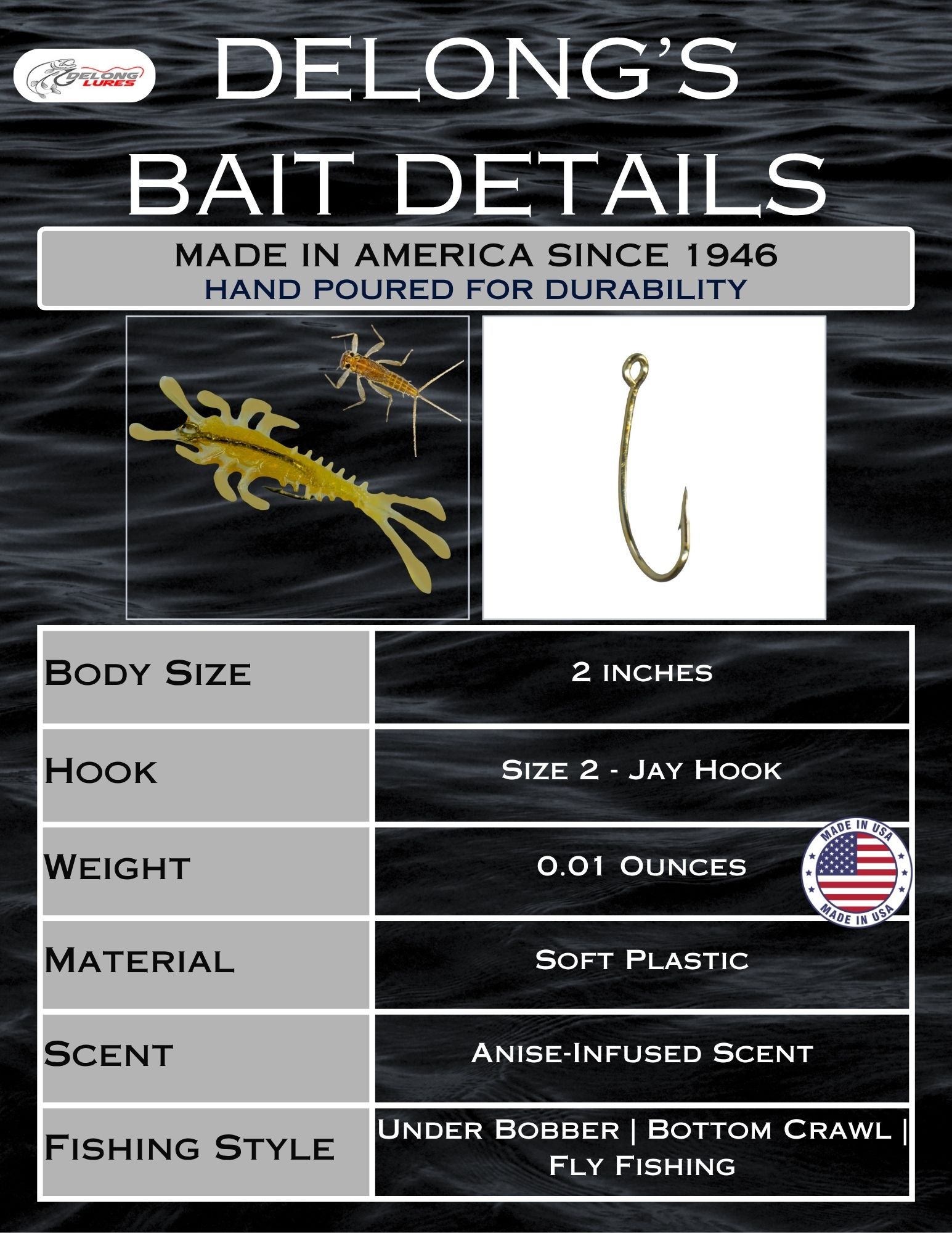 At DeLong Lures, we go above and beyond with every step of the lure making process. We mold every hook in so it wont fall out. We also have a large amount of anise oil mixed into the plastic. This helps to attract more fish! Our mayfly lures are the most popular on the market.
