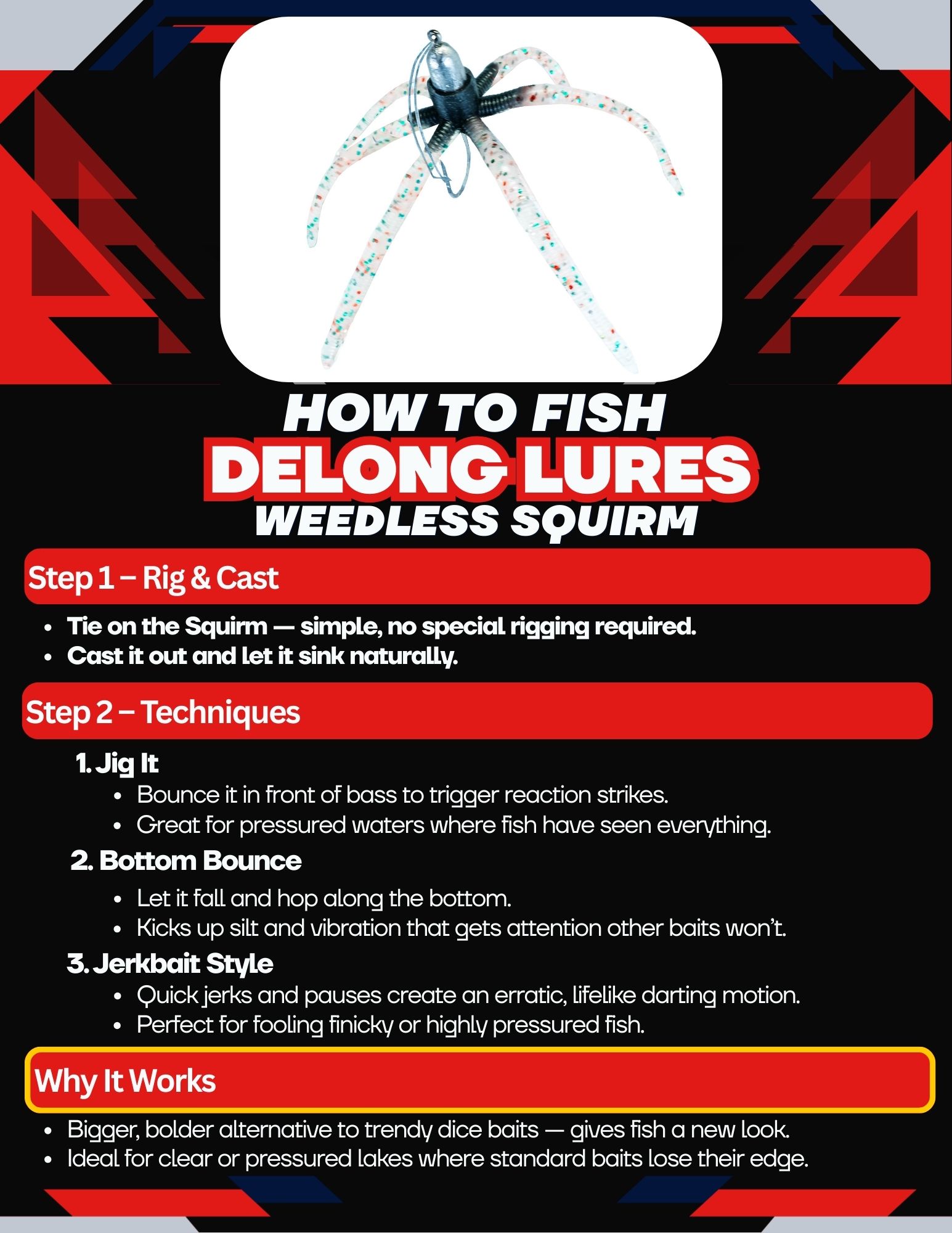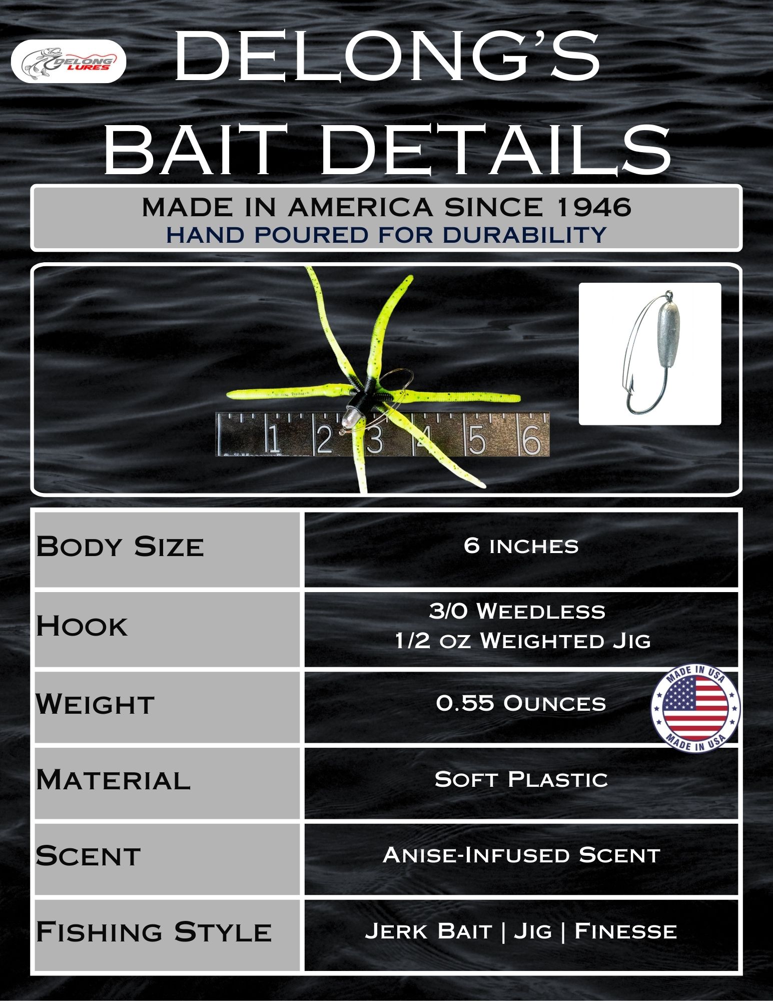 The DeLong Squirm Weedless Jig Bait is a hand-poured American-made bass lure designed for anglers who want a bigger, longer-lasting version of the trendy dice bait. With a weighted weedless hook, soft plastic body, and infused anise scent, The Squirm glides through cover, triggers explosive strikes, and lasts ten times longer than standard lures. It’s part of DeLong’s line of handcrafted, durable, and scented soft plastics trusted by American anglers since 1946.